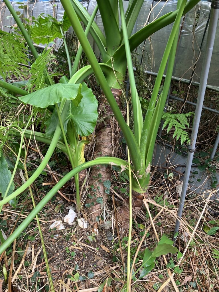 放置ハウスの再生、今日立ちはだかったのは巨大な『クワズイモ』と、縦横無尽に張り巡らされた『蔓(つる)』です。