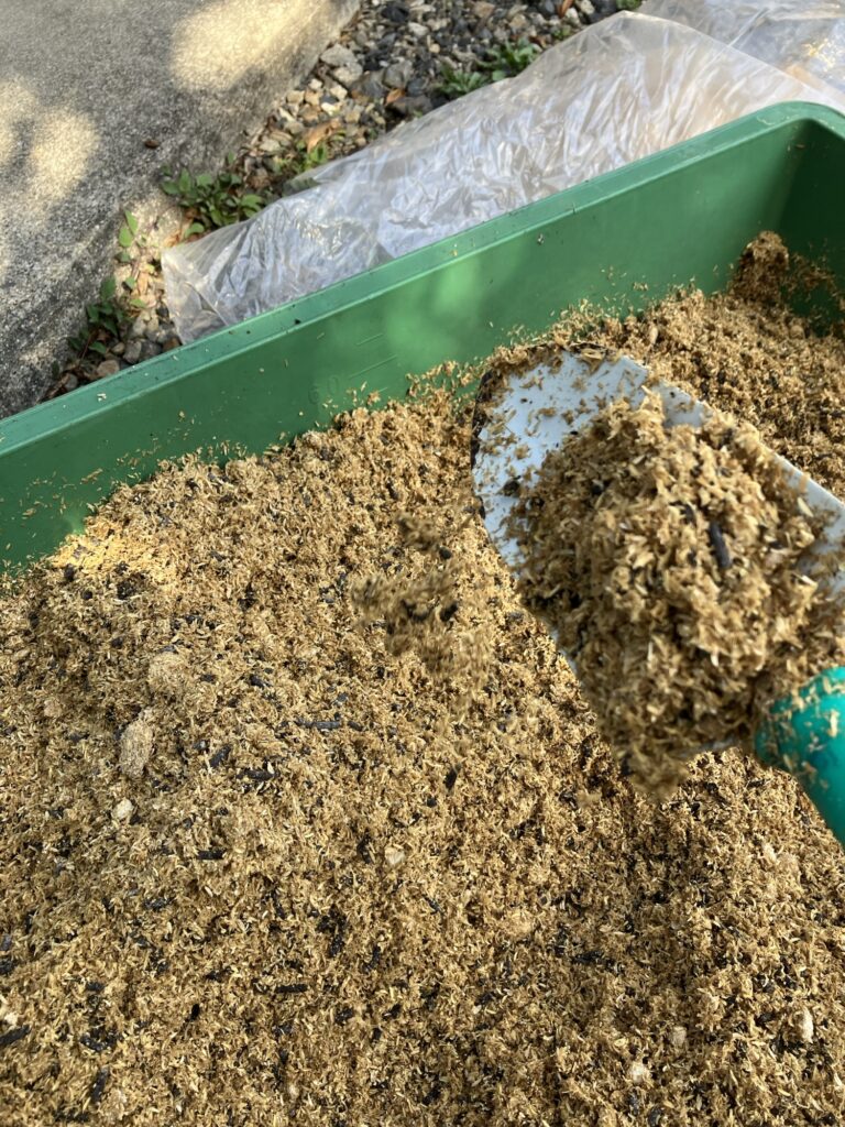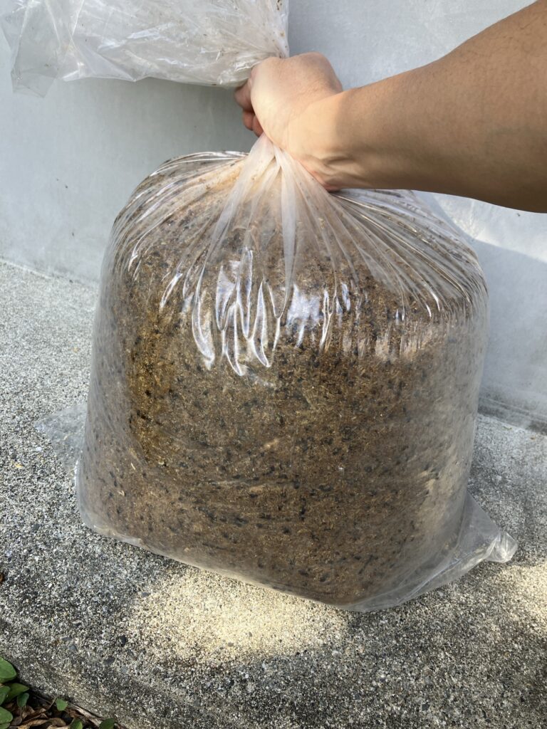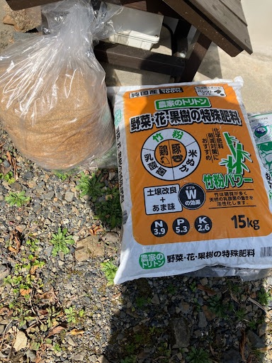 竹粉は乳酸菌が豊富で、土壌改良にはもってこいの資材。屋久島の粘土質の土を、ふかふかの黄金の土に変えてくれることを期待して投入します!