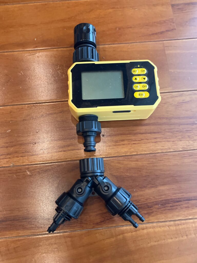 タイマー本体に分岐コネクタを取り付け、ここからホースを伸ばしていきます。