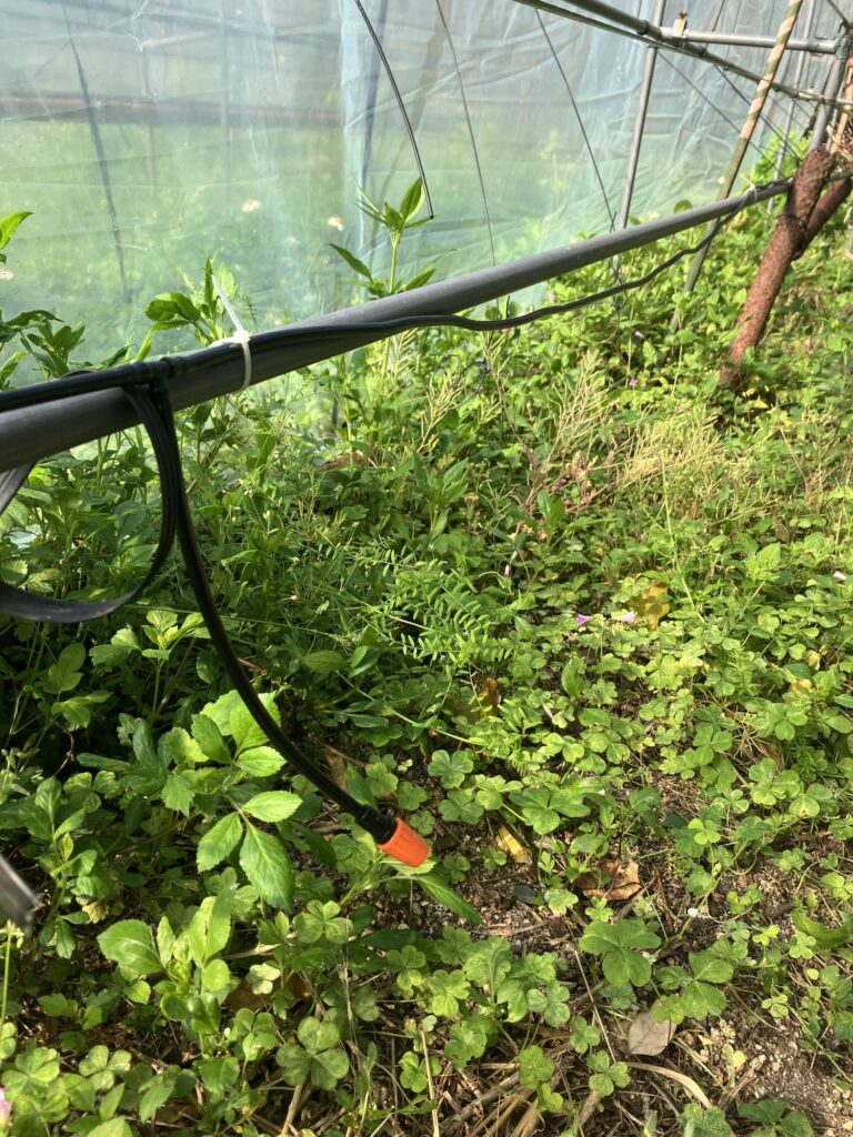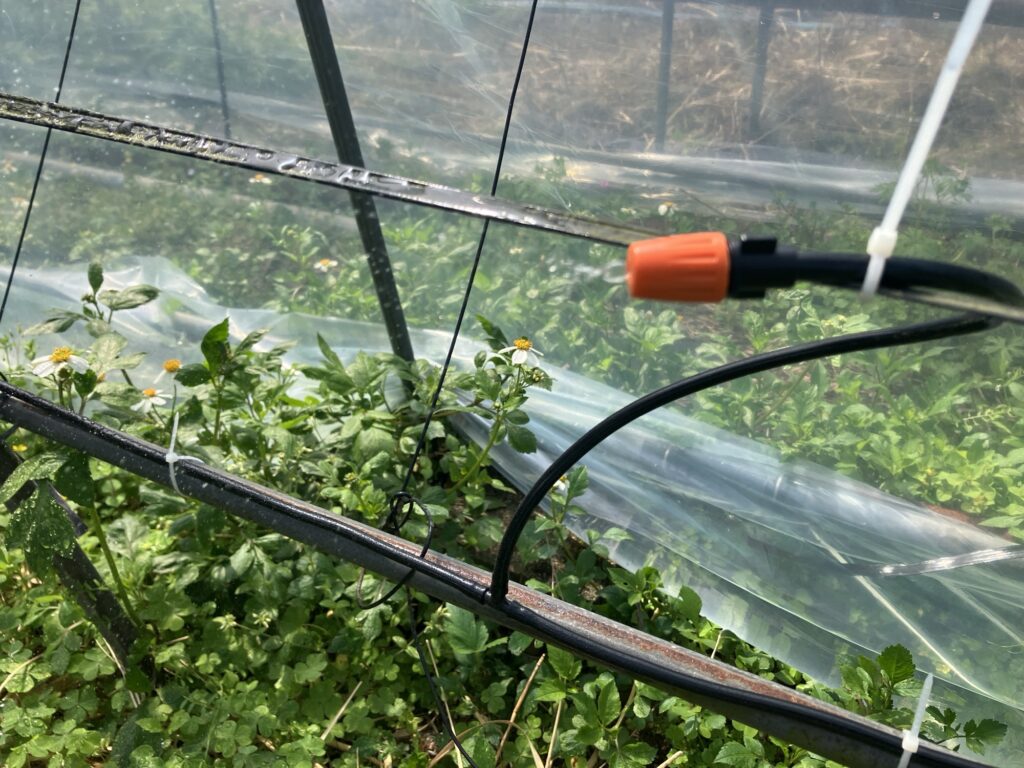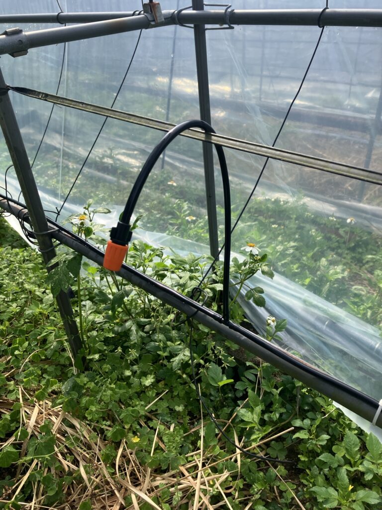 そこでプチ改造。蛇口からハウスの近くまでは「太いホース」で一気に持っていく作戦に変更しました。