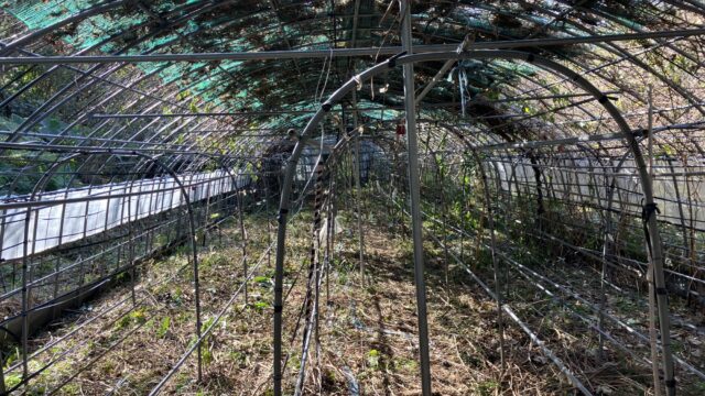 鹿対策のネットも万全。いよいよ本丸、意を決してハウスの内部へ突入します。一歩踏み込むと、そこは外とは別世界の湿気と、圧倒的な草の密度。10年分の歳月が積み重なった蔓と枯れ草が、執拗に足に絡みつきます。絡まる蔓を一本ずつ解き、刈払機のエンジン...